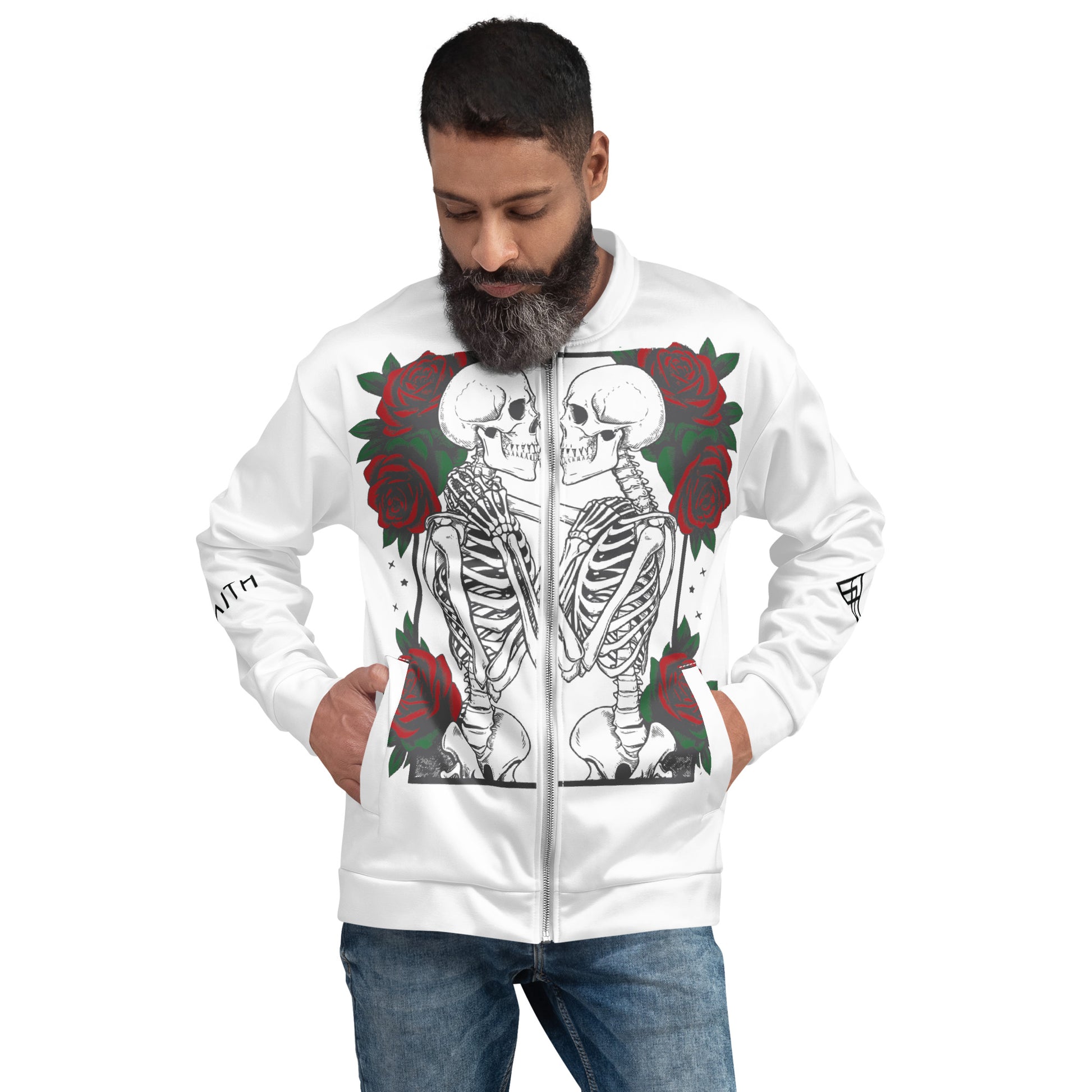 This striking Faith Bomber Jacket blends bold art with deep meaning — featuring two mirrored skeletons surrounded by roses on the front, symbolizing love that transcends time. On the back, the message “Until death brings us apart” completes the story — a poetic reminder that true bonds never fade.