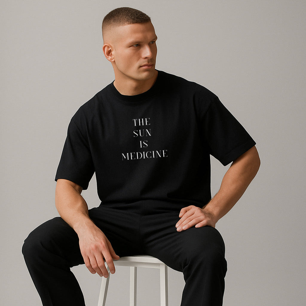 The sun is a symbol of health and vitality, depicted in both an inscription on the upper chest and a tarot card illustration on the back of this shirt. The shirt itself is made of comfortable cotton material.